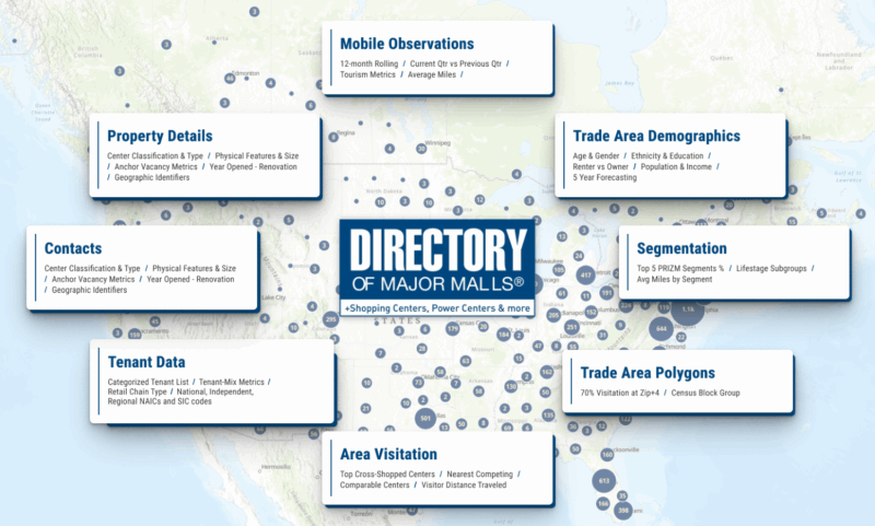 The Directory of Major Malls (DMM)—accessible via ShoppingCenters.com—is North America’s premier resource for major shopping center and mall data, covering over 17,000 properties across the U.S. and Canada (typically 75,000 sq ft+). It tracks more than 360,000 tenant locations and 52,000+ VIP landlord, management, and leasing contacts.